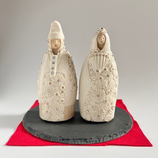 雛守り(ひなまもり)B 〜愛と感謝をつなぐ、大人の雛人形〜 ================ 愛と感謝をつなぐ、雛守り はるか昔。 この小さな人形は、大陸から海を渡り、 奈良、そして平安の都へと伝わりました。 雛人形は、 「飾るもの」ではなく 大切な人の幸せを願い、 災いから守るための お守り でした。 子が生まれ、初節句を迎える日。 母は、その小さな命の健やかな成長を願い、 胸いっぱいの愛情で雛人形を飾ります。 ――どうか、幸せでありますように。 ――どうか、守られていますように。 時が流れ、 その子が大人になり、母のもとを巣立つ頃。 今度は、立場がそっと入れ替わります。 「ありがとう」 「いつまでも元気でいてね」 そんな言葉にできない想いを託して、 雛人形を贈る。 これは、 愛と感謝が行き交う、大人のためのお雛様。 ======= かつては、女の子の成長を祝うために 飾られてきた雛人形。 でも本来の意味は、 年齢や家族構成を超えた 大切な人を守る“雛守り” です。 仕事をがんばってきたあなたへ。 人生を共に歩んできたパートナーへ。 そして、 もしかしたら―― お嬢さんから、お母さまへ。 「いつまでも、元気でいてね」 そんな気持ちを、 形にして贈ってみませんか。 モノではなく、 祈りと物語を贈る雛人形。 あなたの大切な人へ、 そっと、愛を。 ================ Size: お内裏様 約7cm×6cm×17cm お雛様 約7cm×6cm×16cm 陶磁器/クリスタル 台座(石板 ) 直径 約20㎝ 敷物(フェルト) ================ この商品は一組ずつがお似合いとなるように、 すべて一点物となります。 ご了承ください。