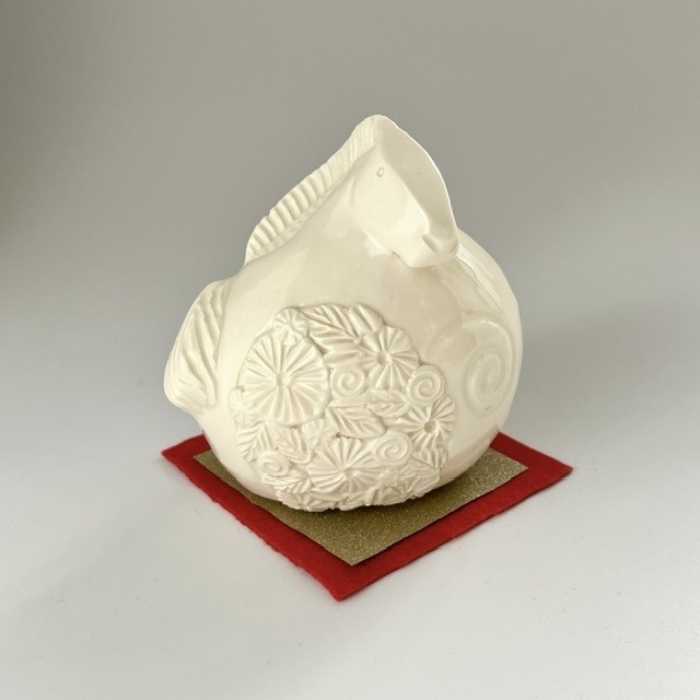 (K.Kさま御約定)干支人形・午 D/ 白い陶器の干支守り ================ 手彫りした花小紋のレリーフが 「清楚で品がいいね!」と言われています。 毎年恒例の干支シリーズ 申年から作り続けて11巡目 2026年は午年です。 干支の「午」をテーマにした、 白い陶器の置物をお届けします! 花小紋と渦巻きのレリーフを施した愛らしい午の姿は 現代のお部屋のインテリアにマッチします。 上品で温かみのあるデザインで、 お部屋を明るくし、見る人の心を 和ませることでしょう。 この一品を通じて、 アナタに幸運が届くことを願っています。 一つ一つが手作りゆえにそれぞれ趣があります。 ぜひお気に入りの干支人形・午を見つけて、 特別な宝物にしてください! ================ <ご存じでしたか?干支飾りのヒミツ> アナタは来年、年男、年女さんですか? お正月に飾るイメージが強い干支ですが、 実はご自身の干支を常に持つことは 運を呼び込む吉ごとと言われています。 ぜひ巳年のアナタの御守りとして、 ご自身の干支をそばに置いてくださいね。 そして大切な方へのお誕生日のプレゼントにも 大変意味あるアイテムとなります。 自分の干支からちょうど6つ目に当たる 干支(午なら子)は、裏干支と呼ばれ、 自分にはない性質を持って、 足りないものを補ってくれるという 言われがあります。 午を飾られるときは 子のアイテムとともに コーディネートすると吉ですよ! ================ サイズ(平均値) 約 8x10x11 /cm 内 素材 陶器 アトリエ陶喜オリジナル ナチュラルラッピング。 いずれもプレゼント仕様らしく お包みします 包装についてはラッピング紹介例を ご覧ください。↓ https://ateliertouki.base.shop/blog/2020/06/01/000000 ================ この商品は一つ一つの個性を生かし、 すべて一点物をコンセプトに作られています。 全く同じお顔や模様の子はおりません。 あなただけの大切な一品との出会いと 御縁を結んでいただきますように。