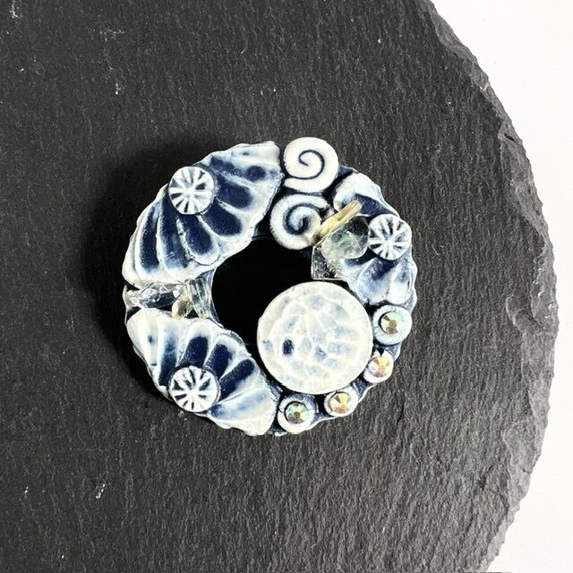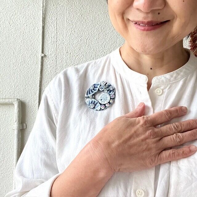 藍の紋章 ― 月のリース /陶と天然石のブローチ