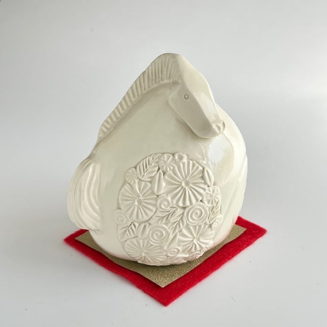 花小紋と渦巻きのレリーフを施した愛らしい午の姿は