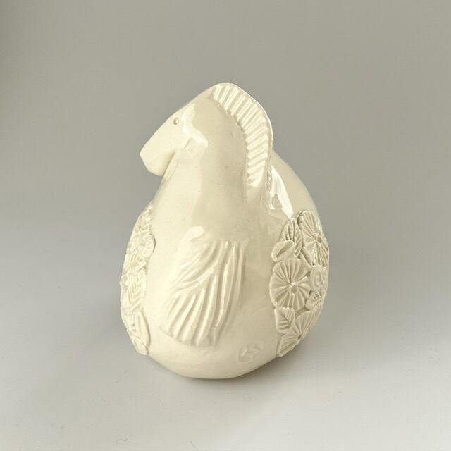 花小紋と渦巻きのレリーフを施した愛らしい午の姿は