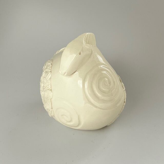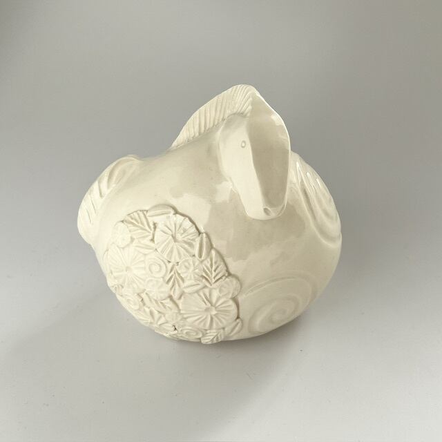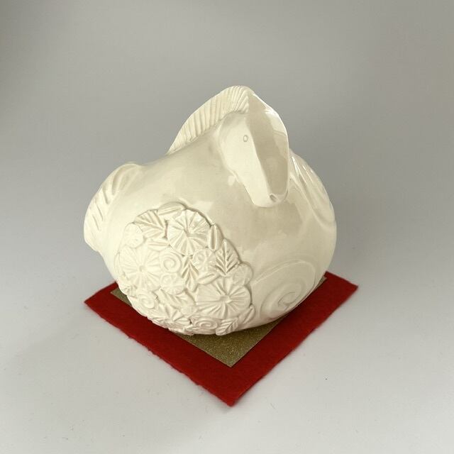 花小紋と渦巻きのレリーフを施した愛らしい午の姿は